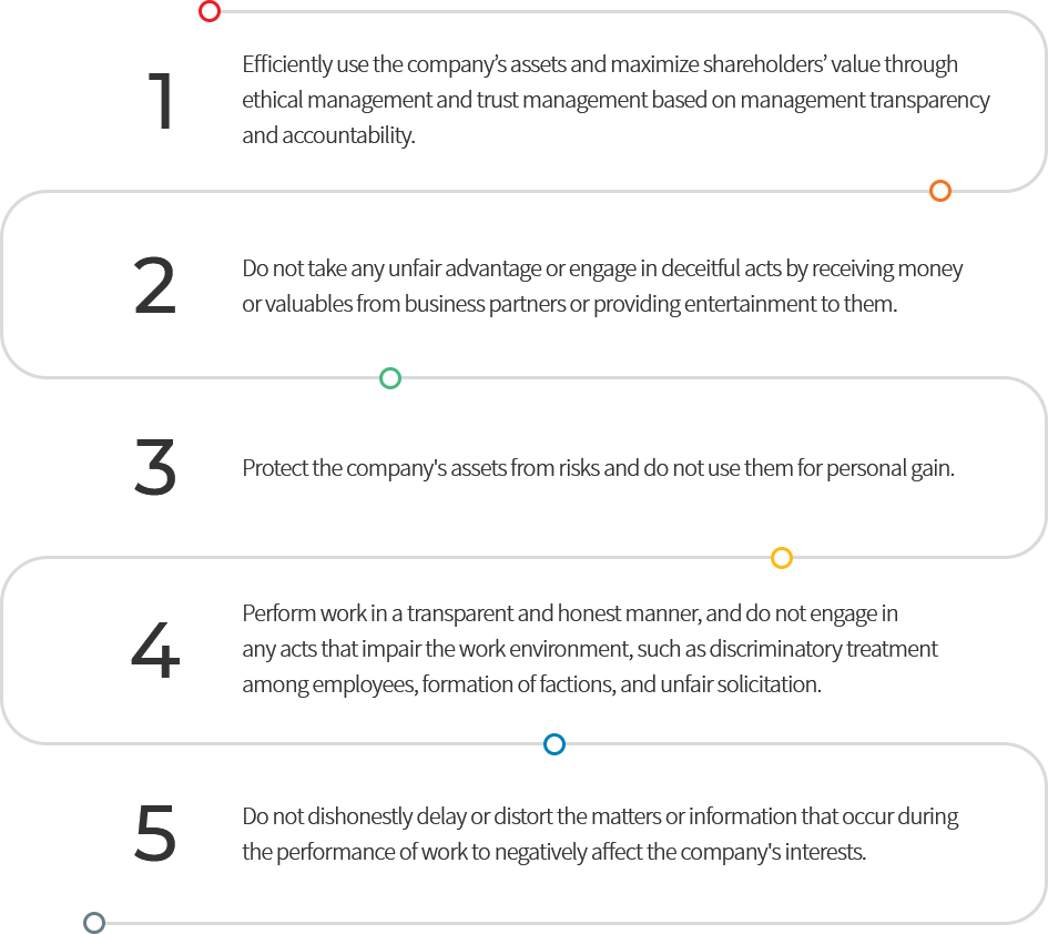 · Do not work as an employee (a director, advisor, consultant, etc.) of another company managed by a stakeholder without prior permission or approval of the Company.<Prohibition of Insider Trading and Unfair Practice>