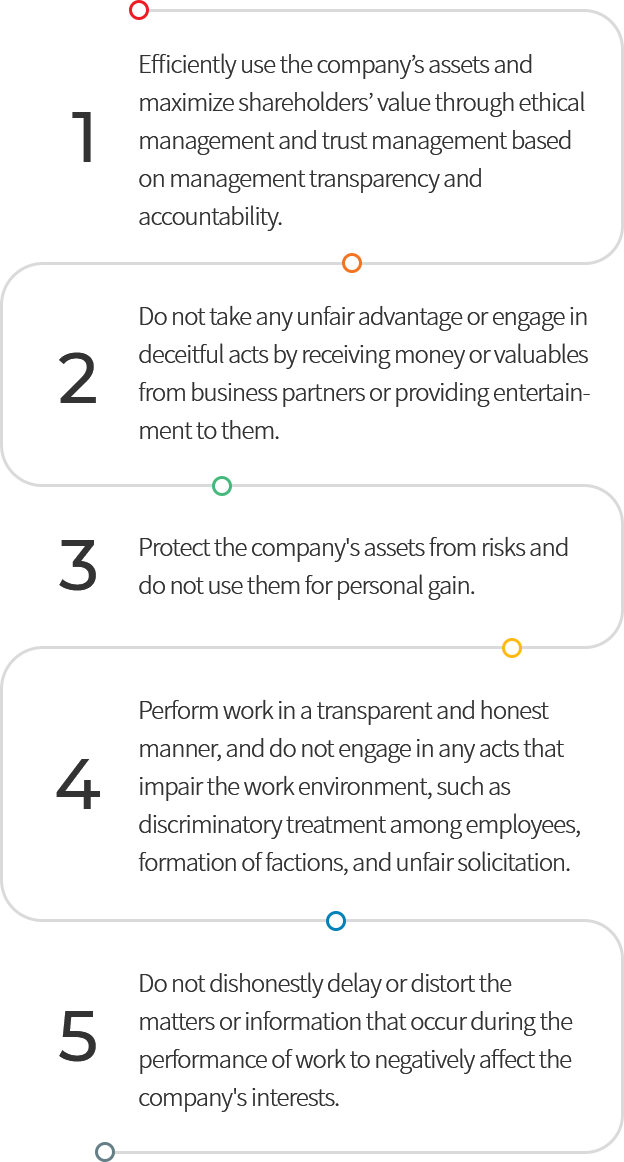 · Comply with all laws and regulations, company regulations and the Code of Ethics related to business processes.<Honest and Sincere Business Process>